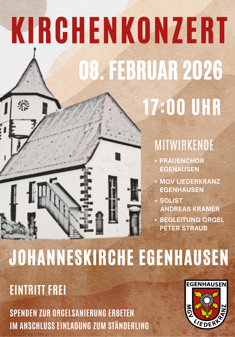 Kirchenkonzert Egenhausen Der Männergesangverein MGV liederkranz Egenhausen und der Frauenchor Egenhausen laden herzlich zum diesjährigen Kirchenkonzert in der Kirche Egenhausen am Sonntag, 08. Februar 2026 um 17:00 Uhr ein. Freuen Sie sich auf einen stimmungsvollen Abend voller Musik, Gemeinschaft und besinnlicher Klänge in der festlichen Atmosphäre der Johanneskirche Egenhausen. Beide Chöre präsentieren ein abwechslungsreiches Programm mit klassischen und modernen Stücken, die zum Innehalten und Genießen einladen. Ort: Johanneskirche Egenhausen Der Eintritt ist frei – um Spenden für die Orgelsanierung wird gebeten. Im Anschluss an das Konzert lädt der Kirchenchor Egenhausen zum Ständerling ein. |